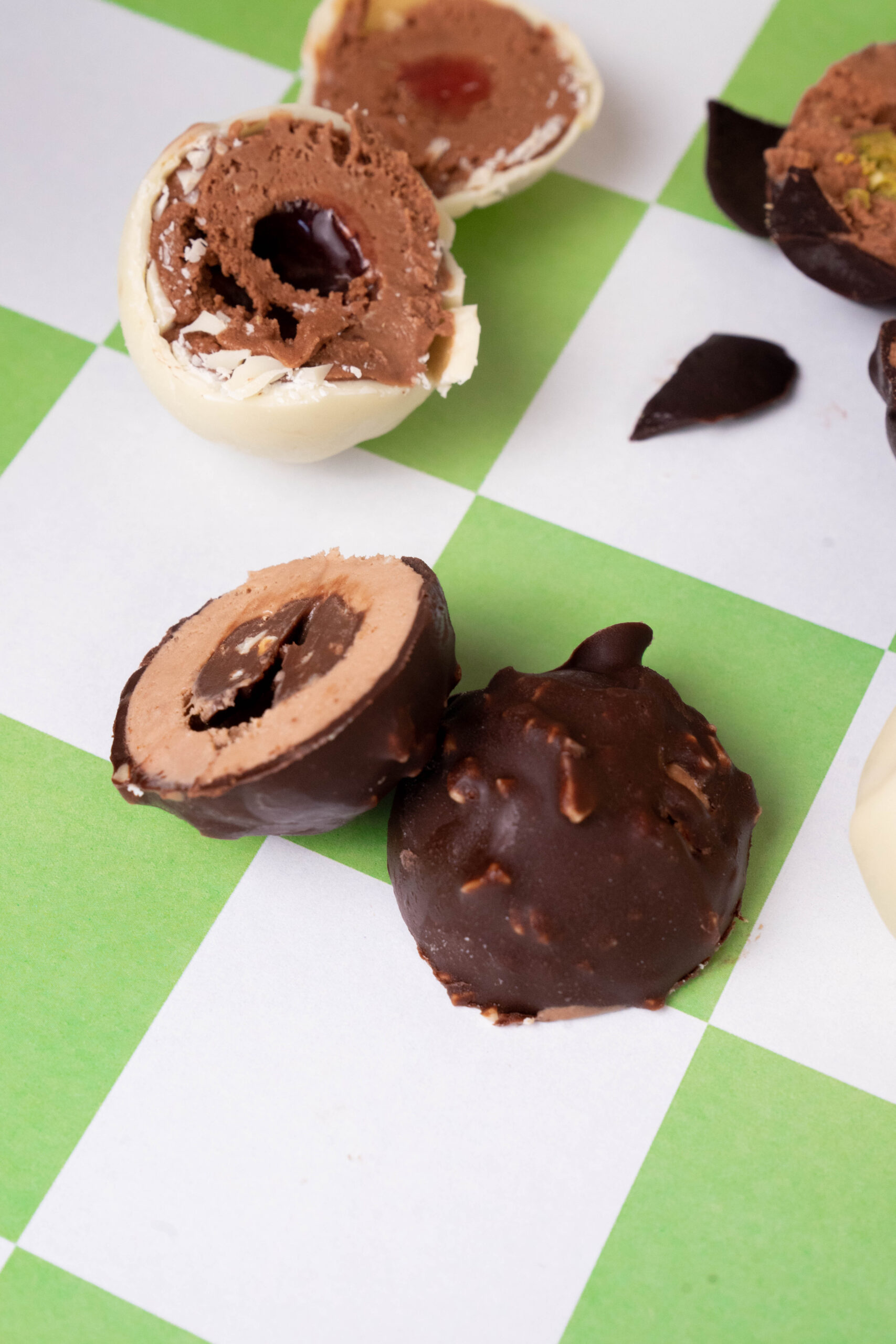 Frambuesa con corazón fluido de la misma fruta, pistacho de carácter noble y ligeramente tostado, y la versión de avellana con núcleo cremoso tipo Nutella construyen